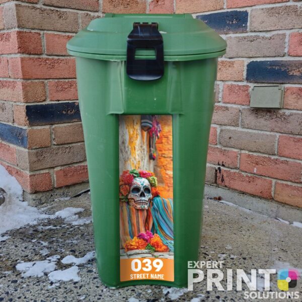 Personalize your green bin (for organics collection) by decorating it with a “colorful day of the dead altar with a decorated skull” customized sticker, adding your address! This simple step makes it easy to identify your bin, especially on windy days when everything gets blown around. Unleash your creativity, think vibrant colors, fun designs, or even stickers that reflect your personality! By personalizing your bin, you’re not just making it visually appealing; you’re helping your neighbors know which bin is yours during collection day.