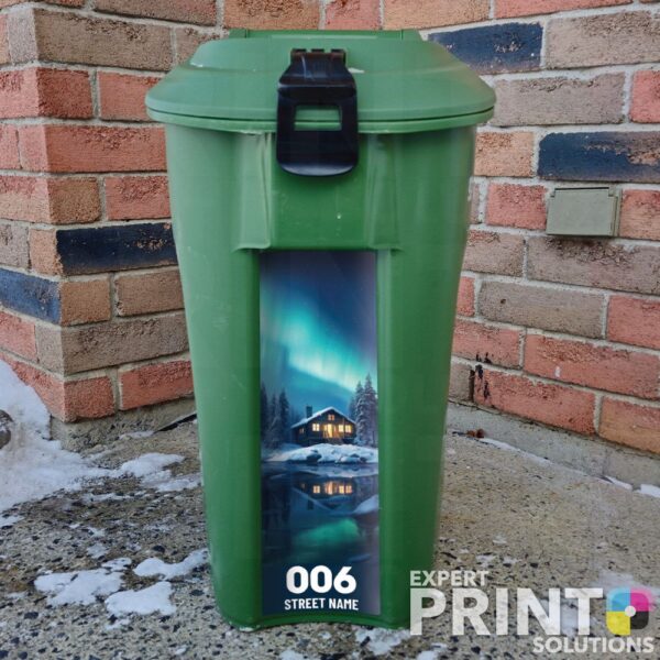 Personalize your green bin (for organics collection) by decorating it with a “snowy winter night landscape with northern lights aurora” customized sticker, adding your address! This simple step makes it easy to identify your bin, especially on windy days when everything gets blown around. Unleash your creativity, think vibrant colors, fun designs, or even stickers that reflect your personality! By personalizing your bin, you’re not just making it visually appealing; you’re helping your neighbors know which bin is yours during collection day.