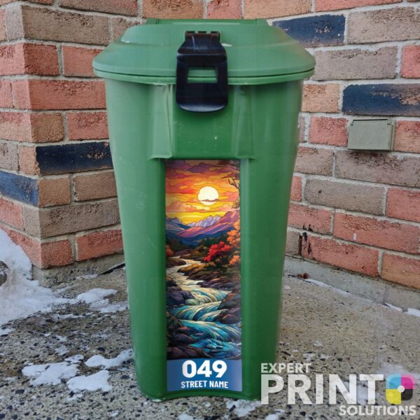 Personalize your green bin (for organics collection) by decorating it with a “stained glass mosaic with natural motifs sunset with river” customized sticker, adding your address! This simple step makes it easy to identify your bin, especially on windy days when everything gets blown around. Unleash your creativity, think vibrant colors, fun designs, or even stickers that reflect your personality! By personalizing your bin, you’re not just making it visually appealing; you’re helping your neighbors know which bin is yours during collection day.